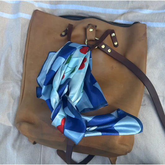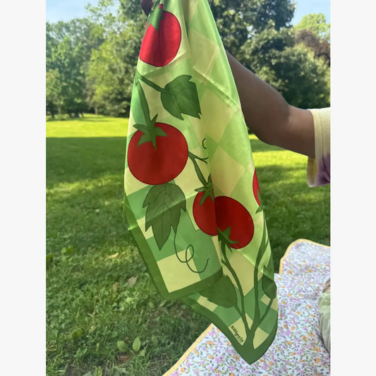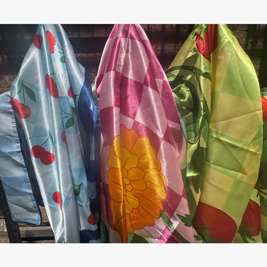 Poly satin scarves—designed to capture all the charm and nostalgia of a lazy, sunny afternoons. Inspired by picnic gingham, seasonal produce, and joyful color, each 66x66 square is a playful, wearable moment.